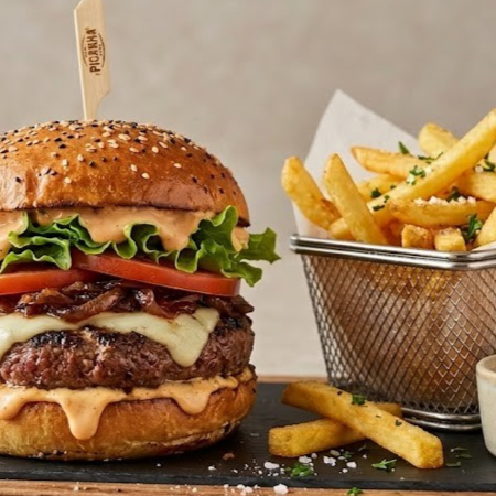 pão artesanal hamburguer artesanal de picanha, tomate, alface, cebola caramelizada, mussarela e molho especial. acompanha fritas