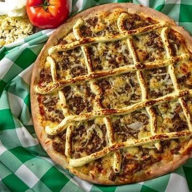 Molho de tomate, mussarela, carne de sol desfiada, cebola e Catupiry