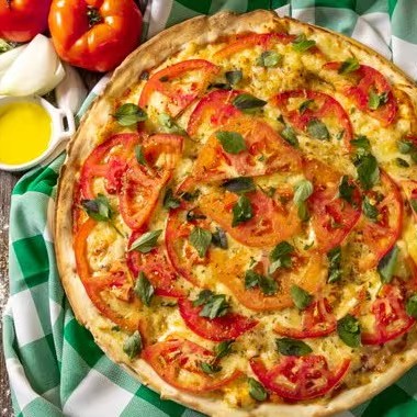 Molho de tomate, mussarela, tomate e manjericão