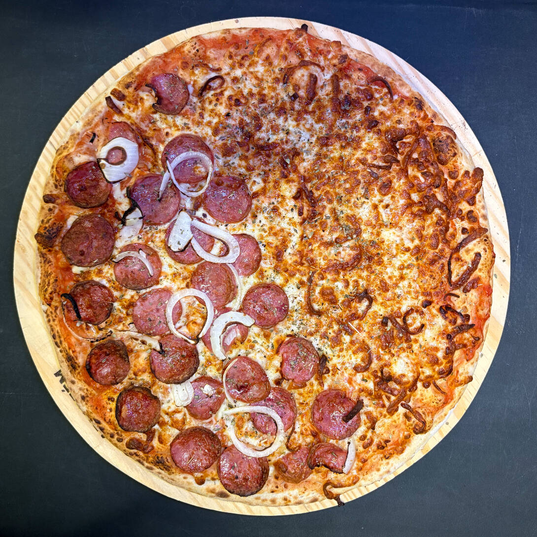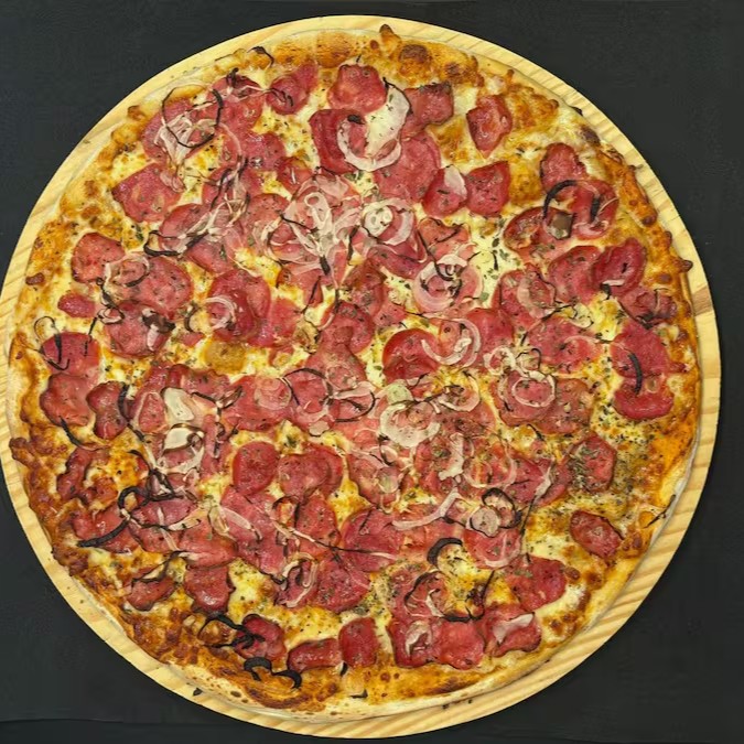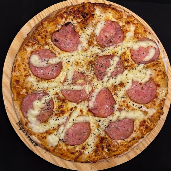 Pizza com molho artesanal, bastante queijo mussarela argentino, calabresa defumada e orégano