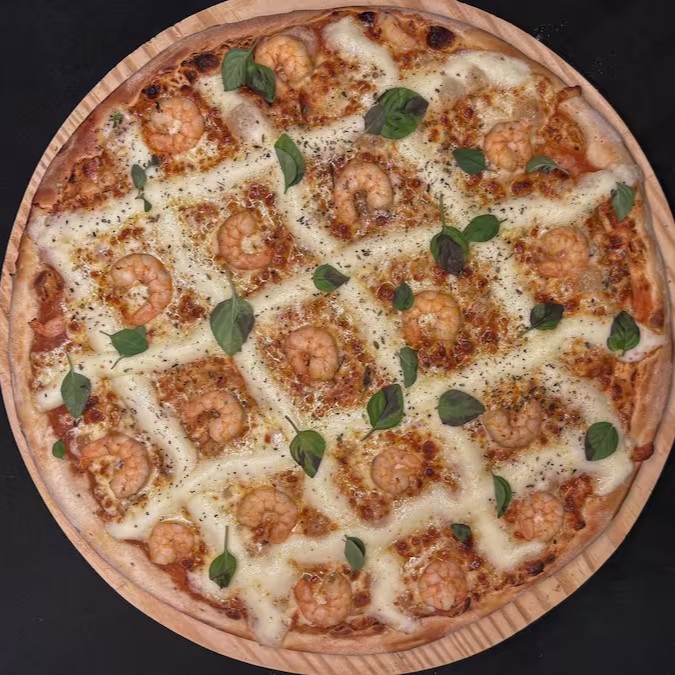 Molho especial e caseiro, queijo mussarela, camarão, catupiry original e um toque de manjericão