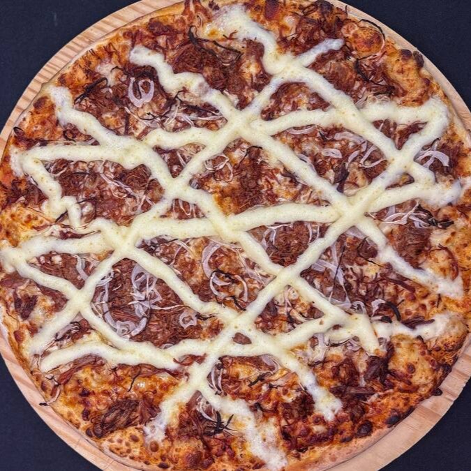 Molho da casa, queijo mussarela derretido, calabresa especial com cebola gratinada e cream cheese maçaricado!
