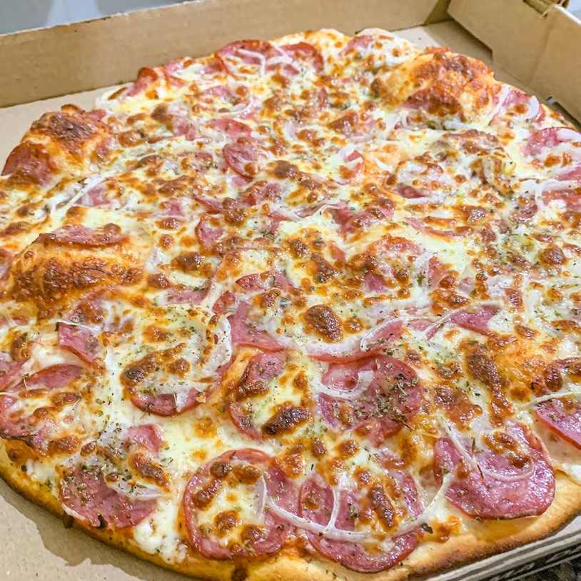 Molho de tomate, mussarela, lombo canadense e Catupiry.