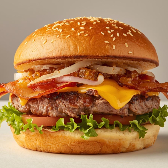Pão Brioche, hamburguer industrial, presunto, queijo mussarela, bacon, salada e cebola caramelizada