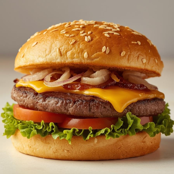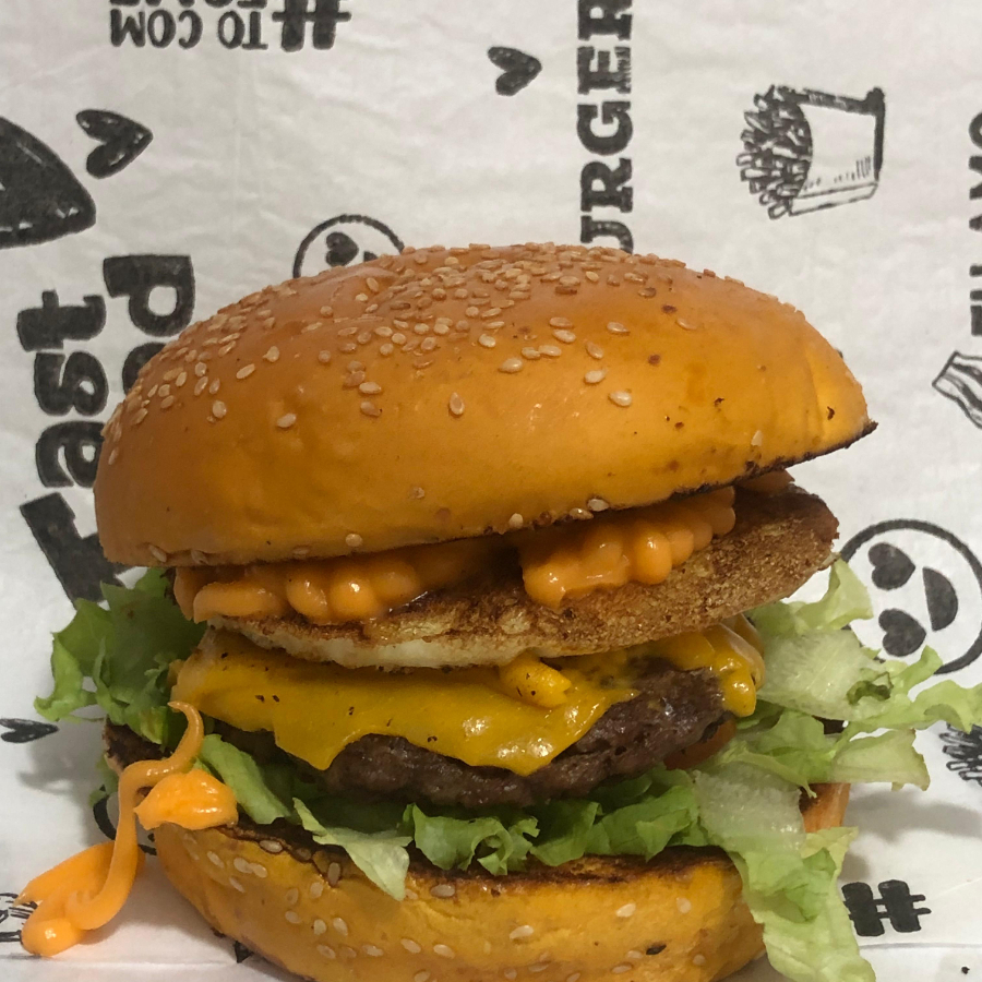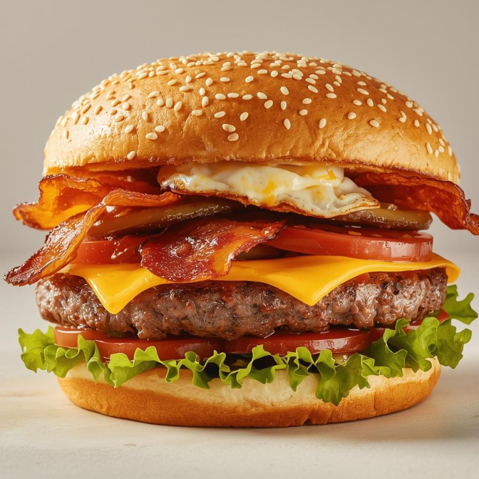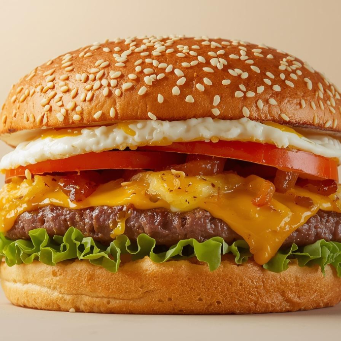 Pão brioche com hambúrguer de acém de 90g, queijo cheddar fatiado, bacon, ovo, calabresa, cebola caramelizada, tomate e alface. Uma combinação deliciosa para quem aprecia um lanche saboroso e autêntico.