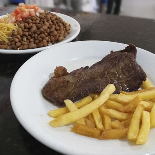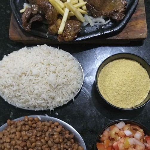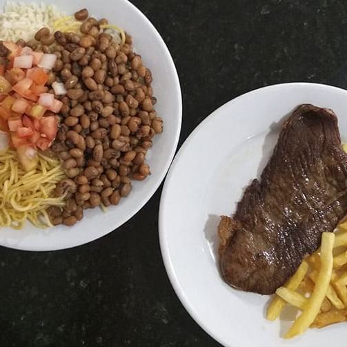 Bife - arroz, macarrão, vinagrete, farinha e feijão (preto, mulatinho ou macassa), batata maionese.