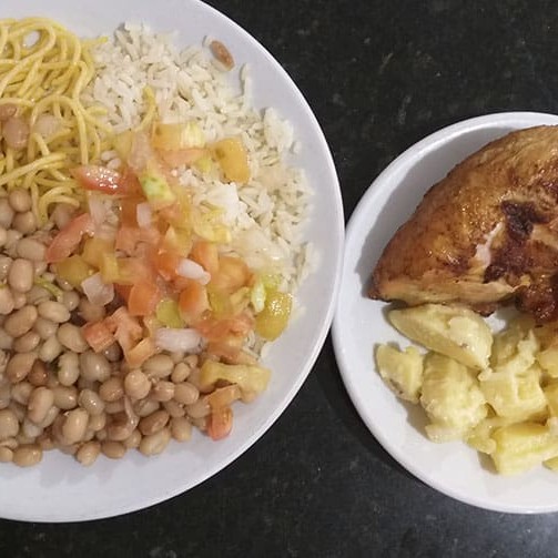 Linguiça ( frango) - arroz, macarrão, vinagrete, farinha e feijão (preto, mulatinho ou macassa), batata maionese.