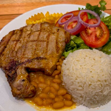 Bisteca de porco -arroz, macarrão, vinagrete, farinha e feijão (preto, mulatinho ou macassa), batata maionese