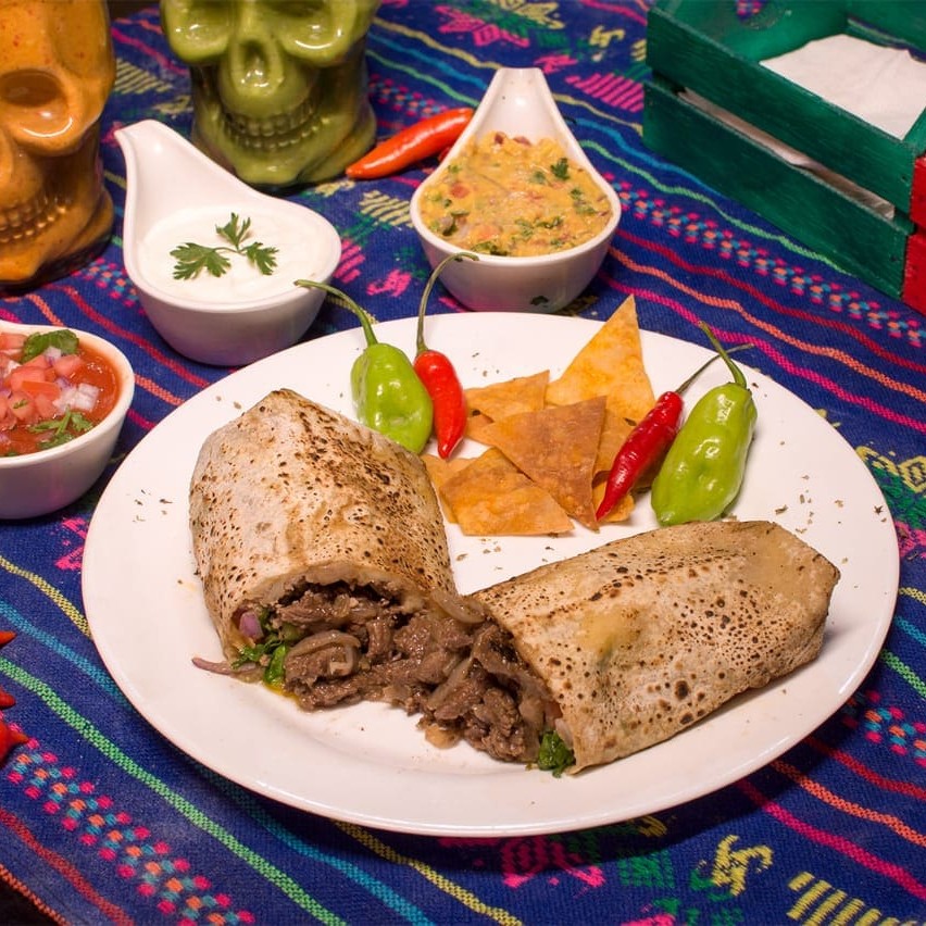 Tortilla coberta com delicioso molho apimentado e queijo mussarela maçaricado por cima. Dentro leva Catupiry, mussarela e sabor à escolha do cliente.