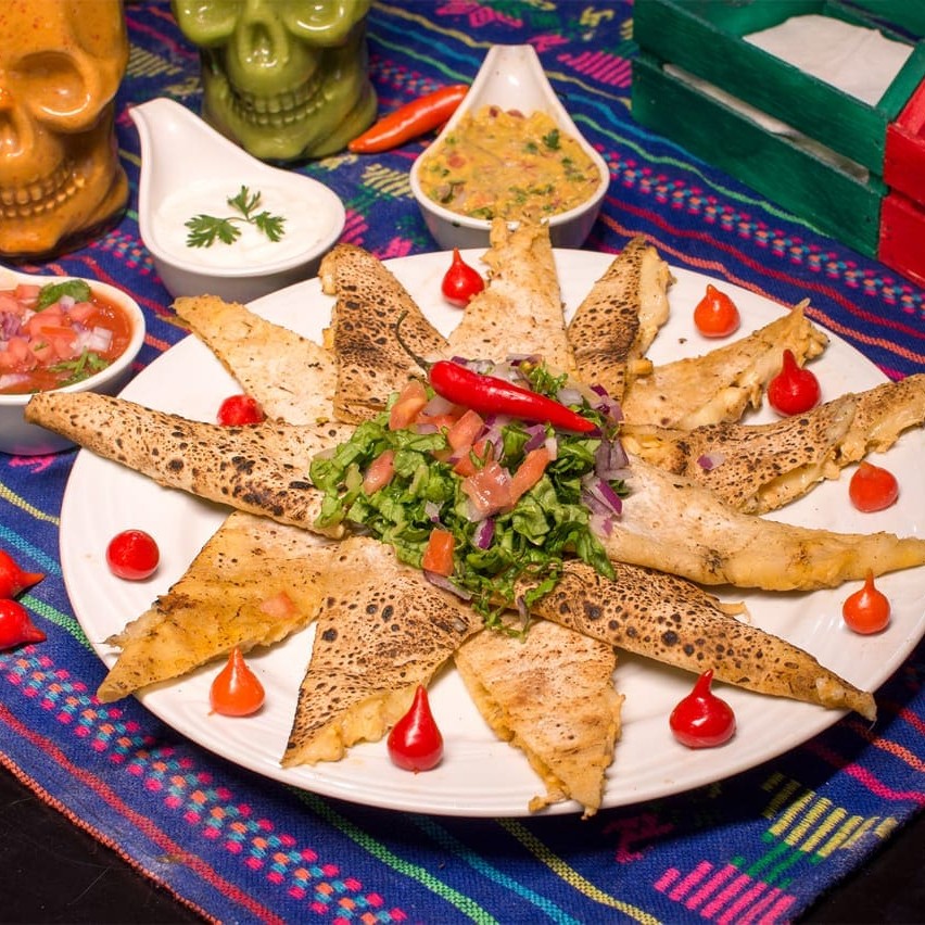 Deliciosos pedaços de quesadilla de picadillo ou pollo com um toque apimentado.