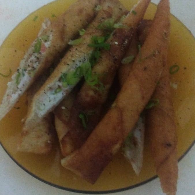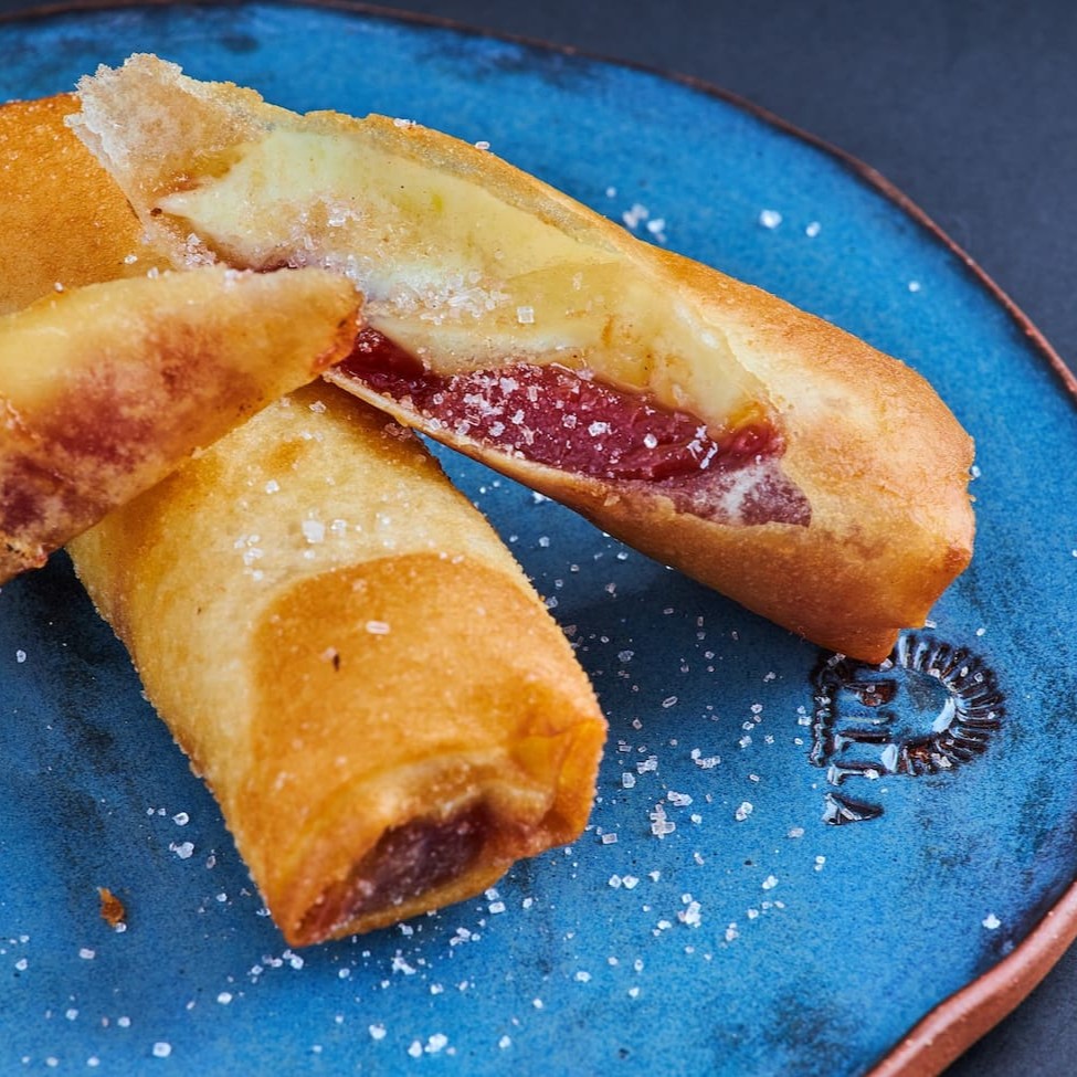 Enrolado na massa harumaki,com queijo coalho,goiabada, açucar e canela