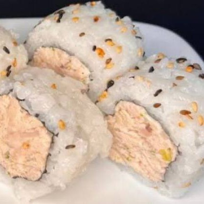 20 peças de enrolado de arroz por fora, pasta de salmão cozido,cebolinho,gergelim.(20 peças já no clone)