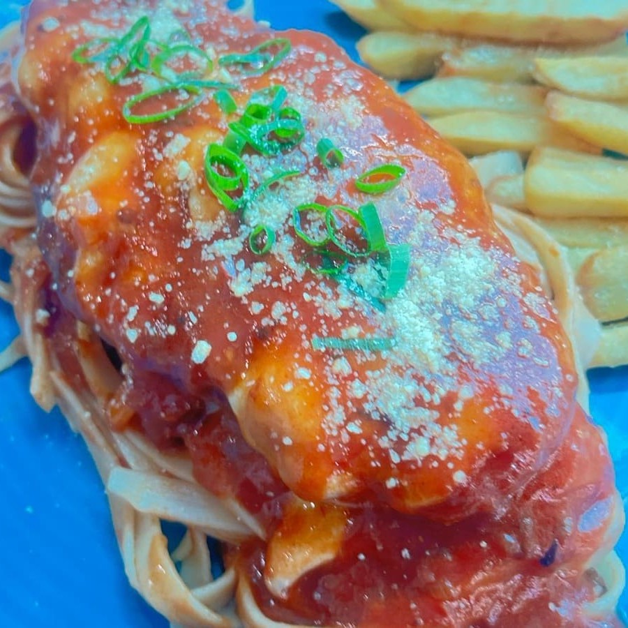 Frango empanado e frito,coberto de molho de tomate e queijo derretido com queijo ralado,ao sugo de macarrão fettuccine ou arroz,acompanahado de batata.