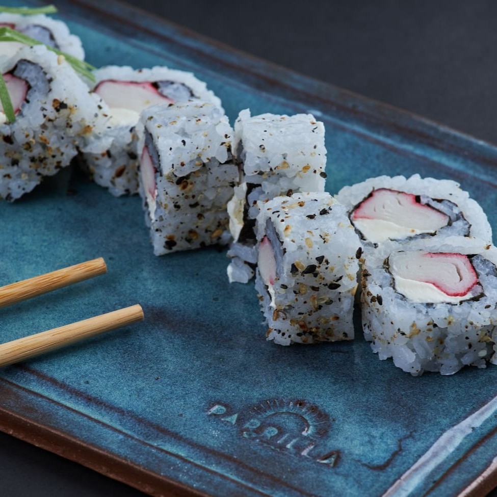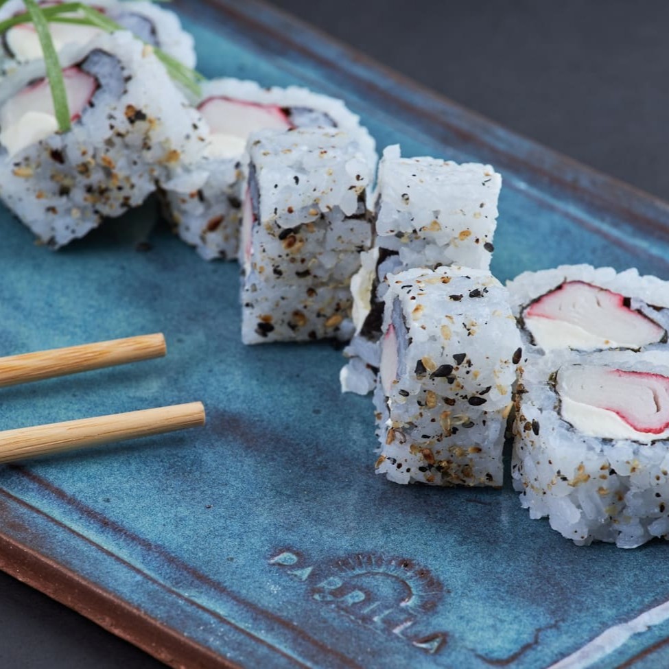 Enrolado de arroz por fora, kani, cream chesse,cebolinho e gergelim