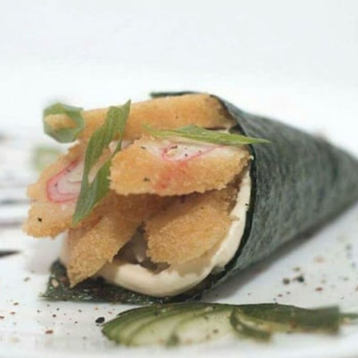 Alga,Tilápia Empanada,Cream Cheese,Arroz,Cebolinho E Gergelim.(2 temaki já no clone)
