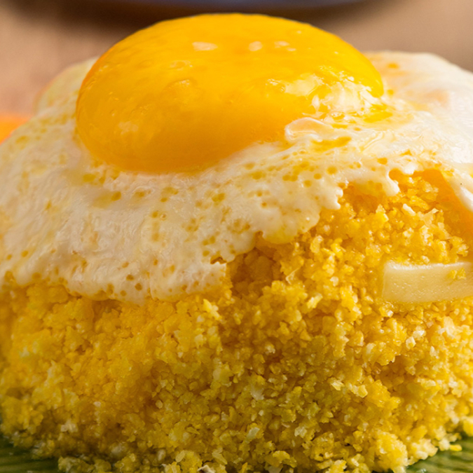 Bisteca bovina com ovo servida com feijão, arroz, macarrão, farofa e vinagrete
