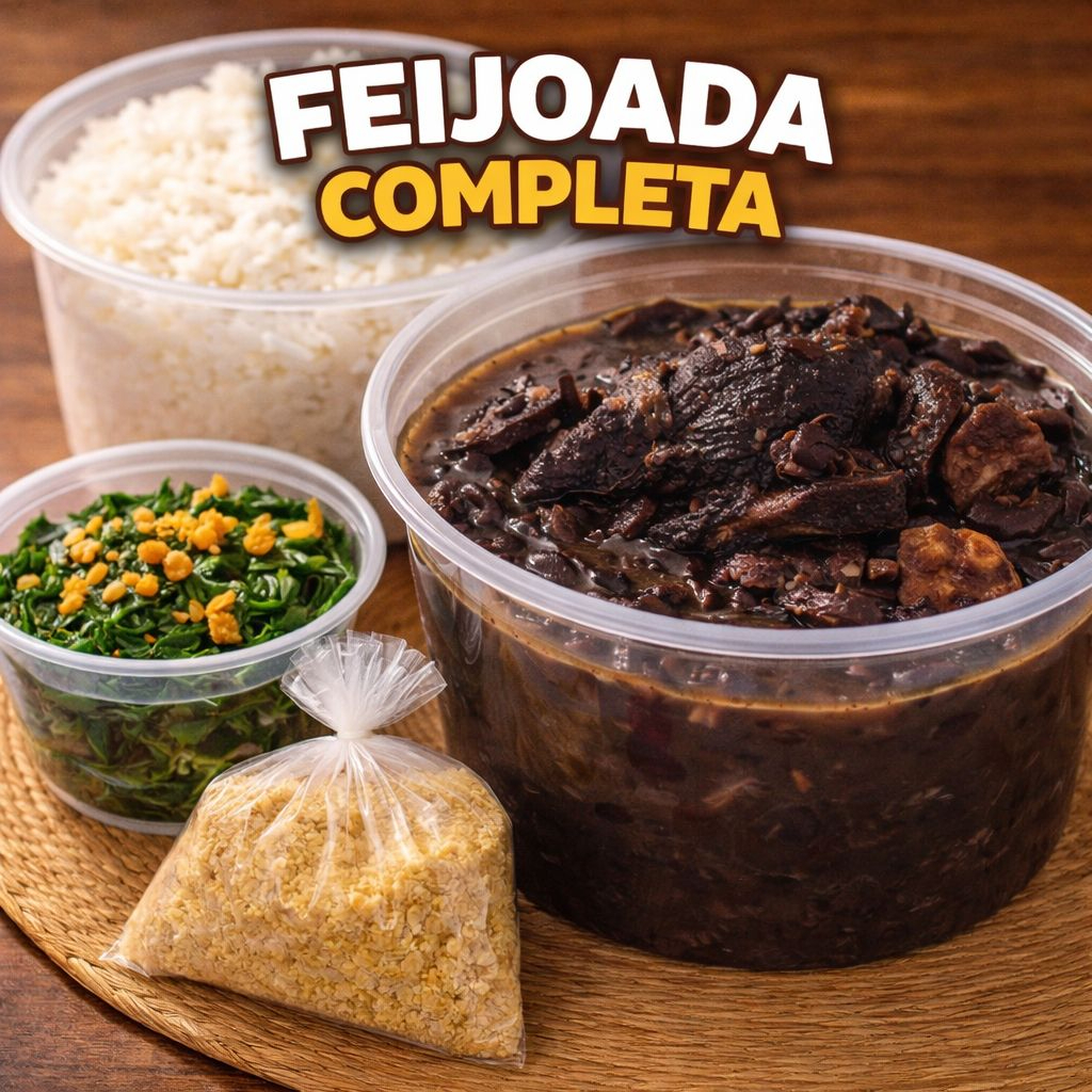 Feijoada Completa produzida com pé, rabo, calabresa, paio, costelinha suína, pernil suíno, acompanhada de arroz cozido no galdo de legumes, couve à mineira refogada com alho frito, e farofa da casa no saquinho. tudo separado!