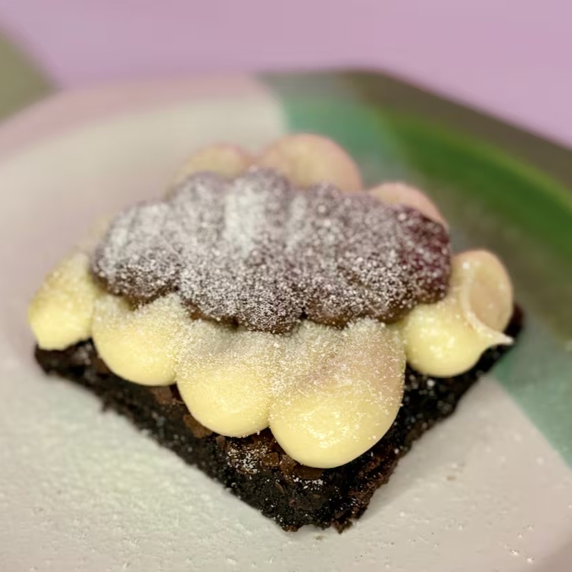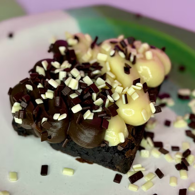 Brownie molhadinho com recheio duo de chocolate 50% e Ninho com toppins de docinhos e granule meio amargo e chocolate branco