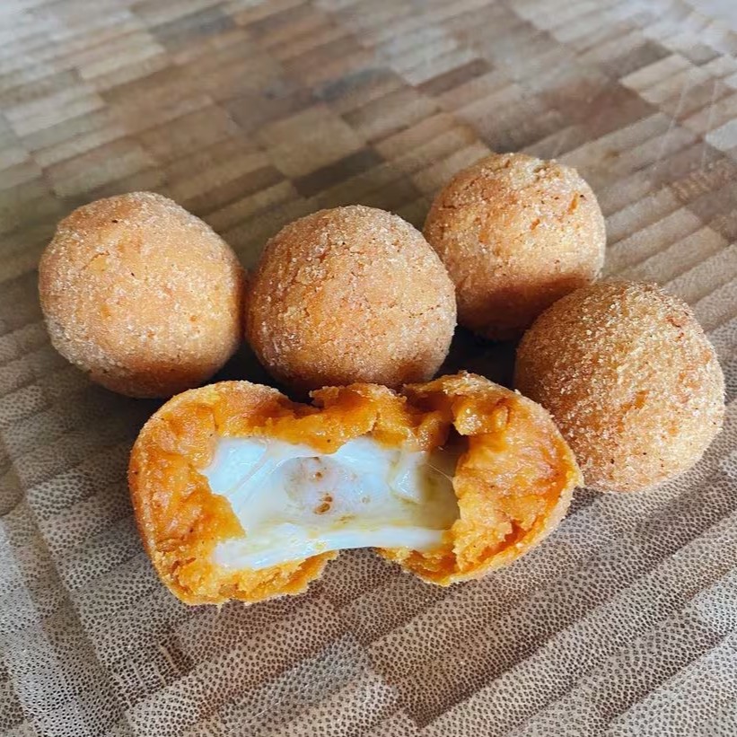 Massa 100% artesanal com recheio de calabresa e queijo empanado na farinha panko
