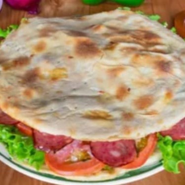 200gr de Calabresa, Pão Sirio, Queijo Prato, Presunto, Tomate, Cebola Caramelizada, Alface, Batata Frita e Molho Caseiro.