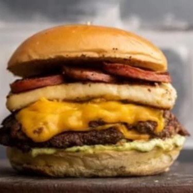 Pão bola, hamburguer artesanal, queijo prato, presunto, bacon, salada e molho caseiro.