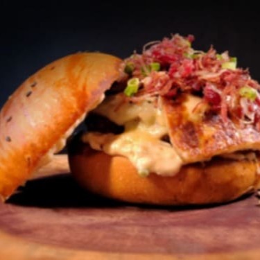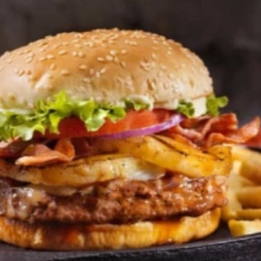 150gr de Frango, 70gr de Bacon, Pão Sirio, Queijo Prato, Presunto, Tomate, Cebola Caramelizada, Alface, Batata Frita e Molho Caseiro.