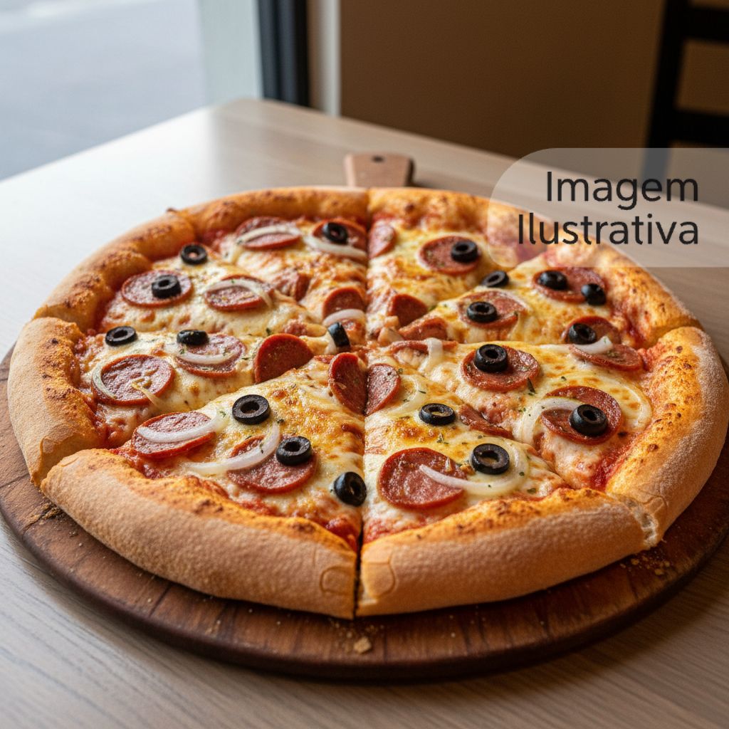 Uma combinação irresistível de calabresa, queijo extra, cebolas e azeitonas , sobre uma crocante massa de pizza.
