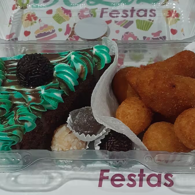 Fatia de bolo 120grs sabor chocolate, Bem casado,Limão, Maracujá, ou Doce de leite escolha na observação do pedidoou doce de leite a na observação do seu pedido)com cobertura de chantininho.08 Salgados (coxinhas, risoles,bol.De queijo frito)04 docinhos (brigadeiro e bem casado).Tudo de bom