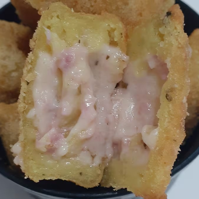 Massa artesanal temperada com queijo e um leve toque de orégano. Recheio de presunto e queijo com leve toque de requeijão. Frito na hora q o pedido chega pra gente