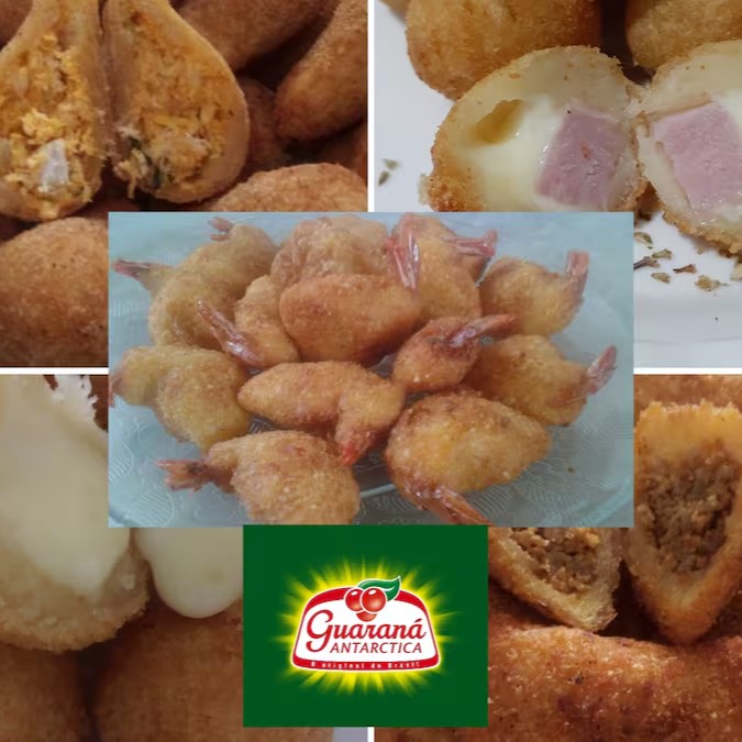10 mini coxinhas + 10 Risoles de carne +10 mini bol. Misto +10 empanados de camarão +10 mini bol.de queijo + 01 Guaraná Antarctica de 01 lt.