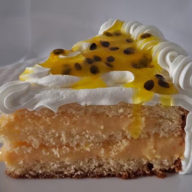 Bolo amanteigado de leite , 2 camadas de creme Caseiro de Maracujá, cobertura de Chantininho.