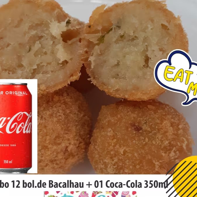 Bol de Bacalhau feito com massa caseira frito na hora acompanhados de refrig Coca-Cola 350ml super gelado. Huuuuuummmm