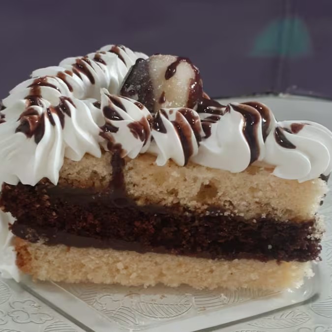 Camadas de bolo de Baunilha e bolo de chocolate e 02 camadas de creme de brigadeiro, e uma deliciosa cobertura de Chantininho.