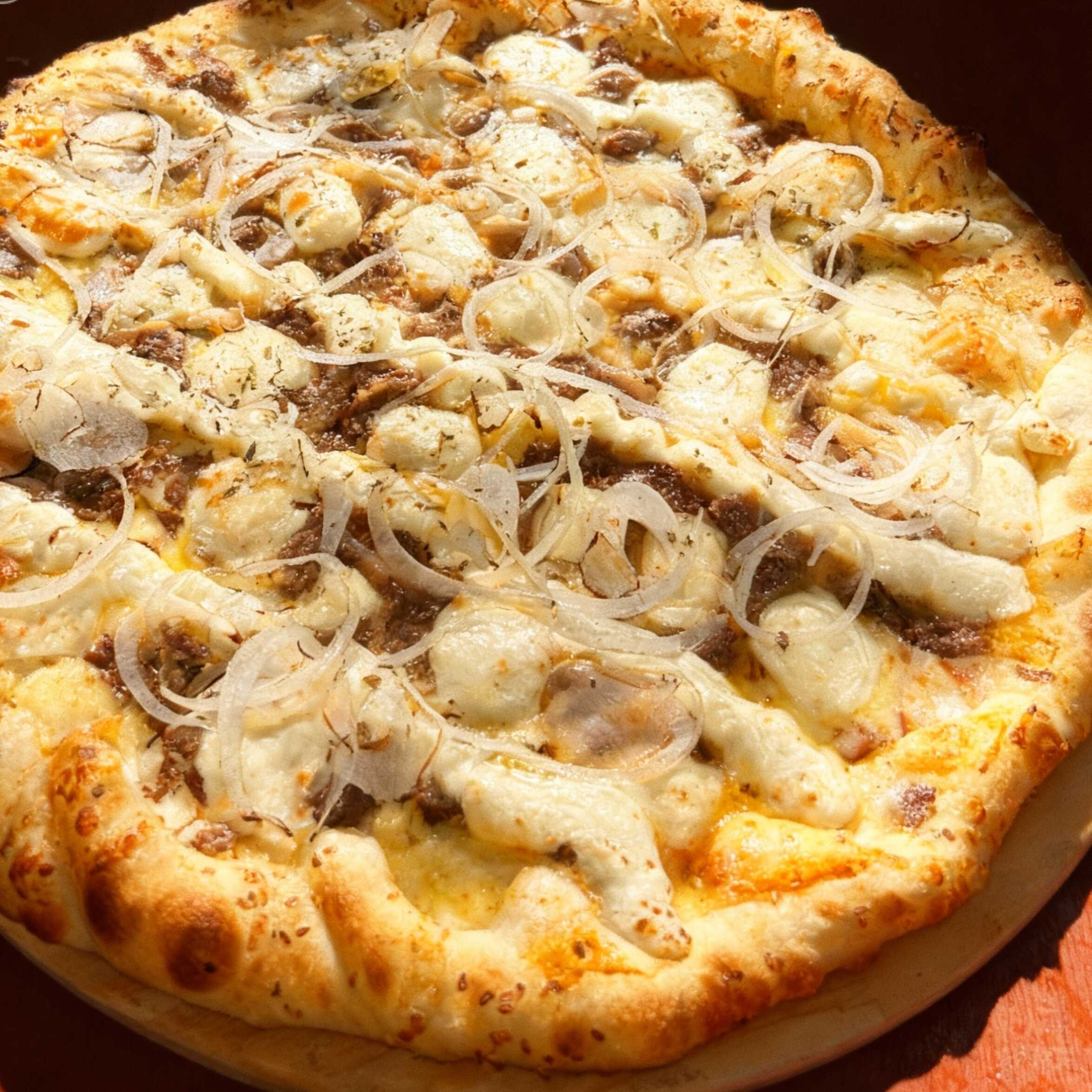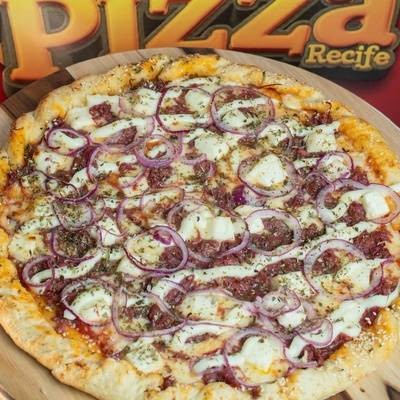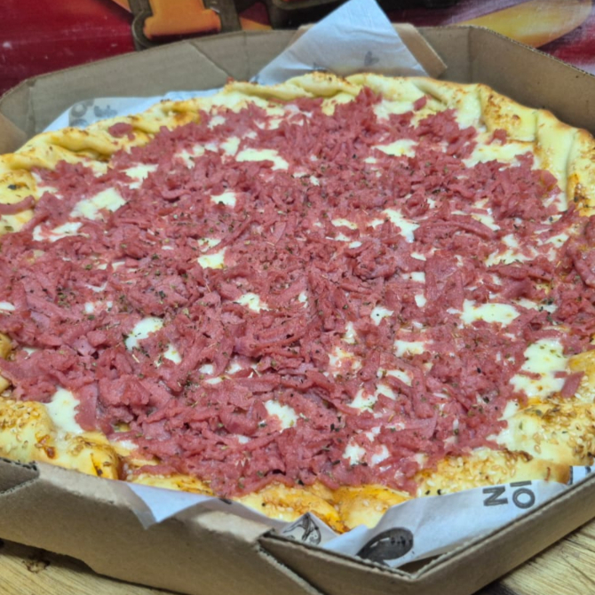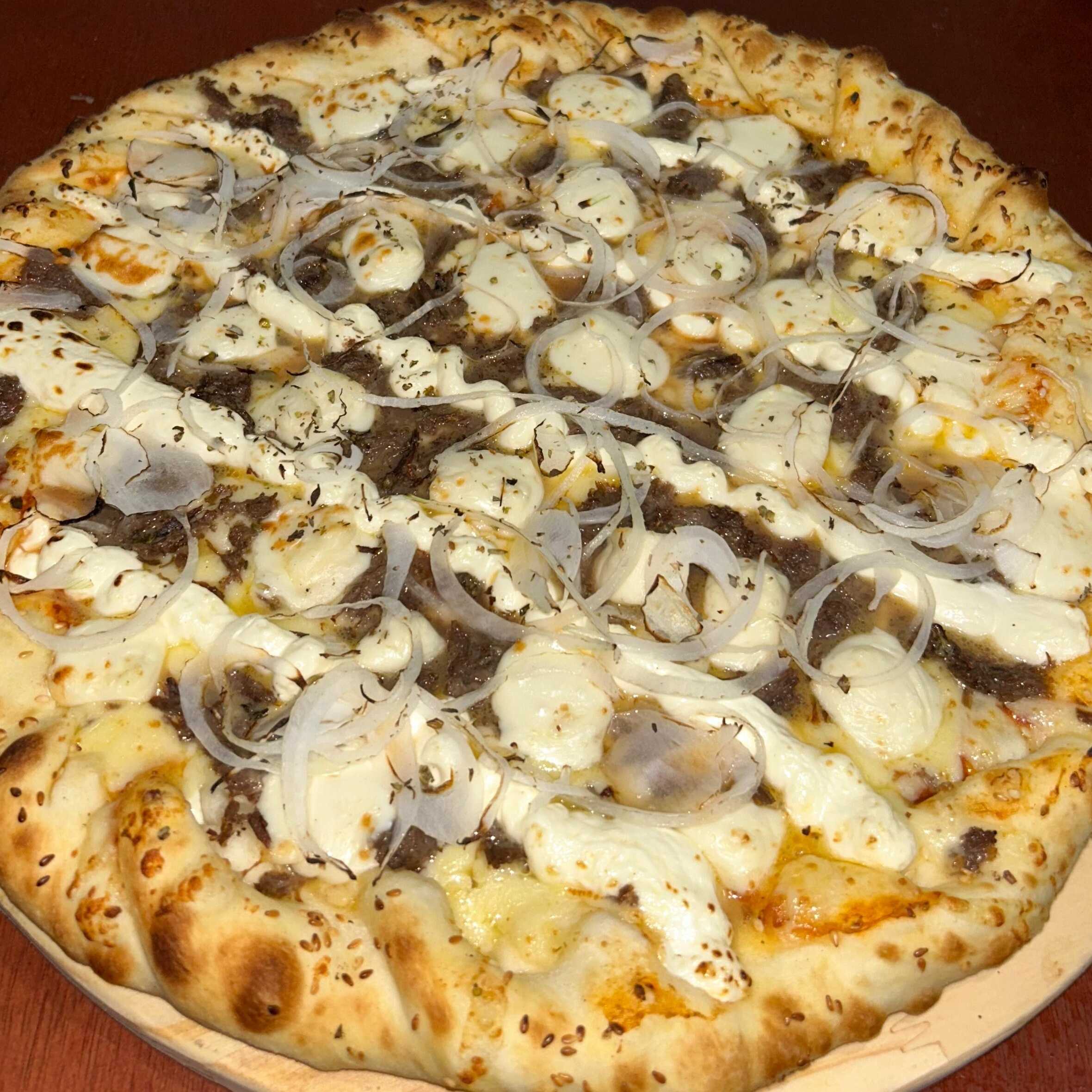 Massa artesanal, molho de tomate caseiro, file charque premium desfiada, cubos de queijo coalho, requeijão catupiry, cebola roxa, orégano e bordas com gergelim, finalizadas com manteiga de garrafa, uma de nossas pizzas mais deliciosas!