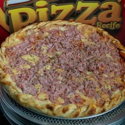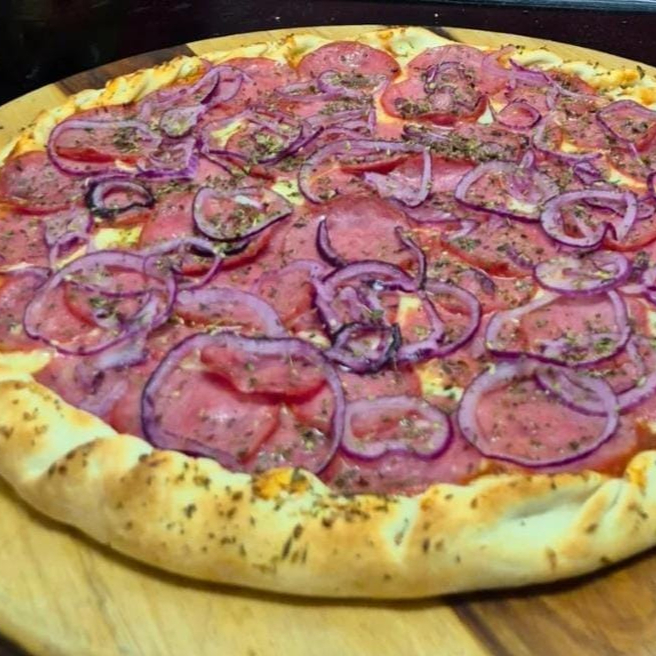 DELICIOSA PIZZA GRANDE DE PRESUNTO E QUEJO ARGENTINO, LEVA MOLHO ESPECIAL DE TOMATE, ORÓEGANO, MASSA FINA E BORDAS SALTEADAS NA MANTEIGA DE GARRAFA E GERGELIM,