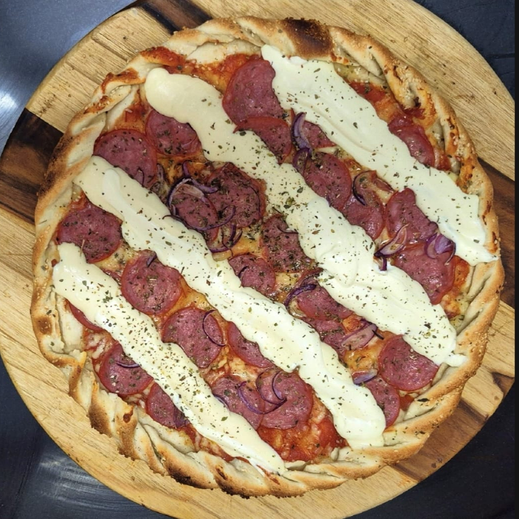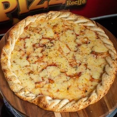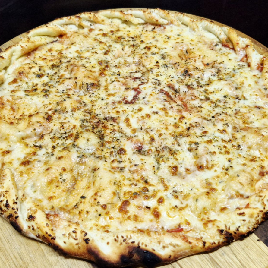 Deliciosa Massa artesanal, generosa camada de queijo mussarela, cheddar, requeião catupiry, molho de tomate caseiro, orégano e bordas com gergelim, finalizadas com manteiga de garrafa. O equilibrio perfeito entre 3 queijos irresistiveis!!