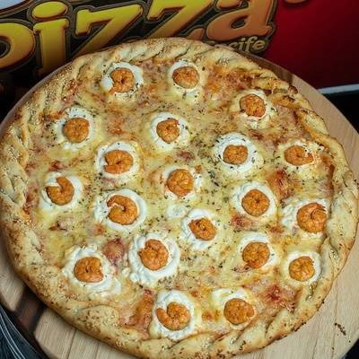 Massa artesanal, molho de tomate caseiro, queijo mussarela, filé de camarão salteado no azeite, requeijão catupiry, orégano e bordas com gergelim, finalizadas com manteiga de garrafa, a queridinha da bella pizza!