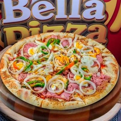 Pizza artesanal com molho de tomate caseiro, mussarela, ovos cozidos, presunto, cebola roxa, tomate, pimentão, orégano e gergelim nas bordas, finalizada com manteiga de garrafa. Uma das nossas pizzas mais deliciosas!
