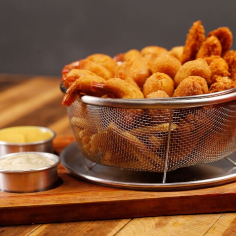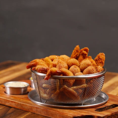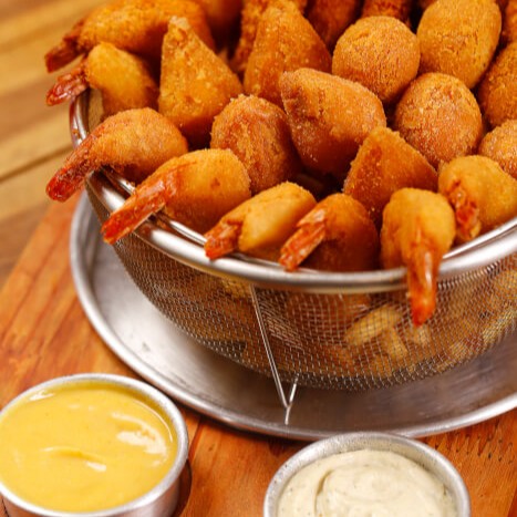 10 tiras de filé crocante + 10 filés de camarão empanado + 10 bolinhas de queijo + 10 mini coxinhas de massa +batata frita sequinha e crocante + 2 opções de molho.