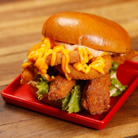 Pão brioche amanteigado, tiras de filé crocante, cebola empanada coberto com queijo cheddar, alface e 1 molho da sua preferência