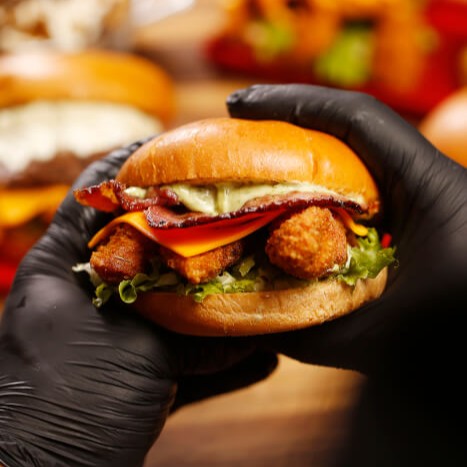 pão brioche amanteigado, tiras de filé crocante, bacon coberto com queijo cheddar, alface e 1 molho da sua preferência.