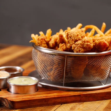 10 tiras de filé de frango crocante + 10 files de camarão empanado +batata sequinha e crocante + duas opção de molho.