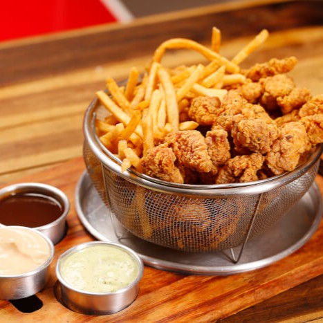 3 tiras de filé crocante + 3 filés de camarão empanado + 3 bolinhas de queijo + 3 mini coxinhas de massa +batata frita sequinha e crocante + 2 opções de molho.