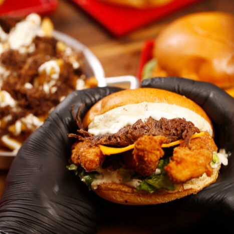 Pão brioche amanteigado, tiras de filé crocante, suculento queijo cheddar, cream cheese maçaricado, carne de sol desfiada na chapa, alface e 1 molho da sua preferência.