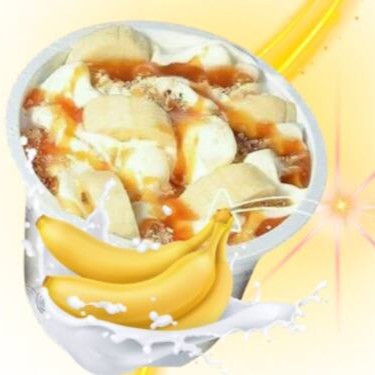 Sorvete servido no pote de 300ml, coberto por Farinha Láctea Nestlé, doce de leite e banana fatiada.