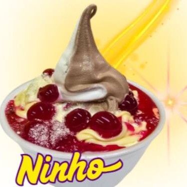 Sorvete de 300ml, coberto por leite em pó, calda de cereja e creme de ninho..