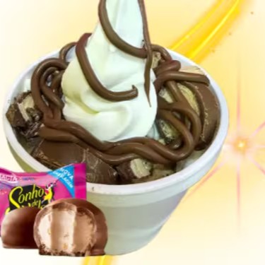 Sorvete de 300ml, coberto chocolate com avelã e Sonho de Valsa em pedaços.