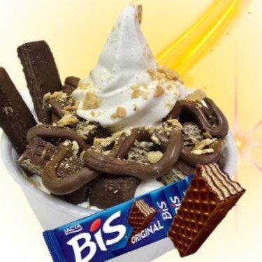 Sorvete de 300ml, coberto por chocolate com avelã e Bis em pedaços.