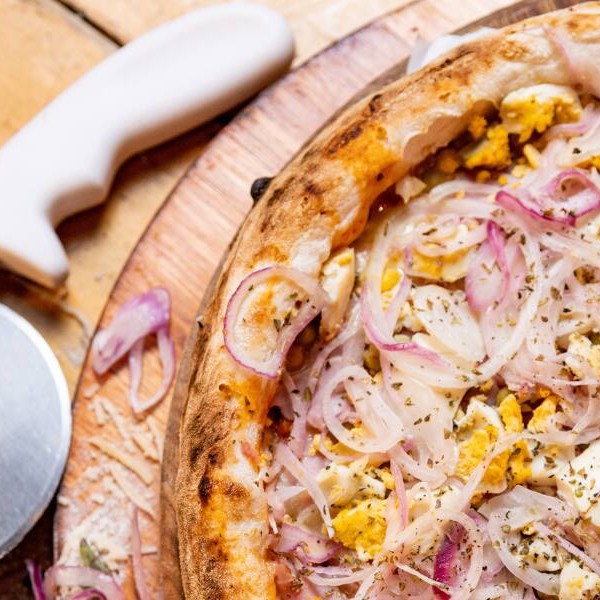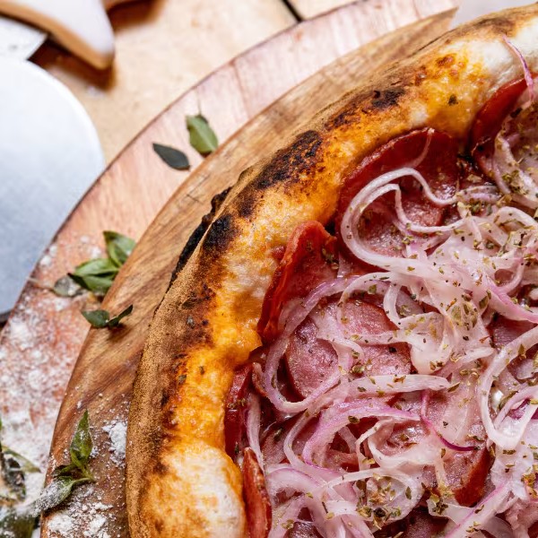 Uma explosão de sabores nessa pizza estilo Napolitana. Feita com farinha Italiana 00, molho de tomate caseiro, generosas fatias de calabresa, mussarela argentina derretida, mix de cebolas frescas, azeitonas e orégano perfumado. Perfeita para compartilhar entre 2 a 3 pessoas e se deliciar!