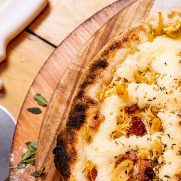 Uma explosão de sabores irresistíveis! Pizza estilo Napolitana, com a fina farinha italiana 00 e o molho de tomate. O frango defumado desfiado traz um sabor defumado e suculento, enquanto a mussarela argentina derrete em perfeita harmonia. O Catupiry cremoso adiciona um toque irresistível, e o bacon crocante traz uma camada extra de sabor. As azeitonas e o orégano completam essa combinação deliciosa. Projetada para servir de 2 a 3 pessoas